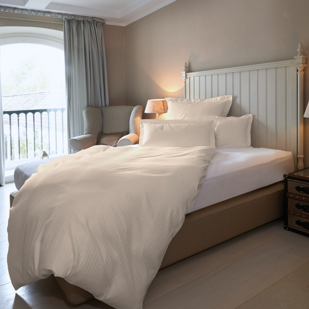 Setti sisältää myös No Problem Innsbruck satiiniraitaisen tyynyliinan 55x65 cm sekä No Problem Innsbruck satiiniraitaisen pussilakanan 155x235 cm. Nämä viimeistelevät hotellimaisen vuodekokonaisuuden loistavasti! Suuren lankaluvun ja satiiniraidoituksen ansiosta nämä tyynyliinat ja pussilakanat tuntuvat erittäin sileiltä ja ylelliseltä ihoa vasten.