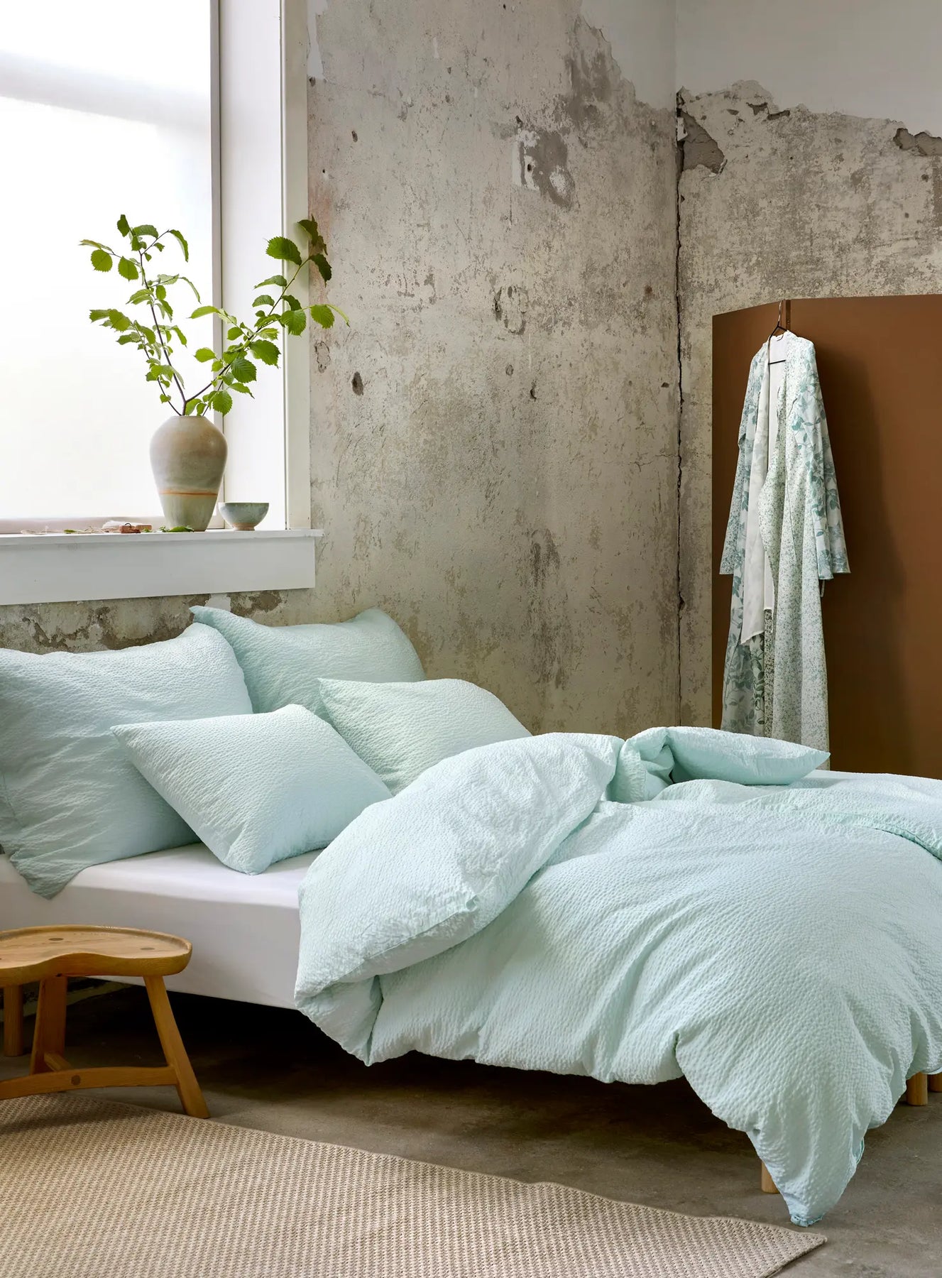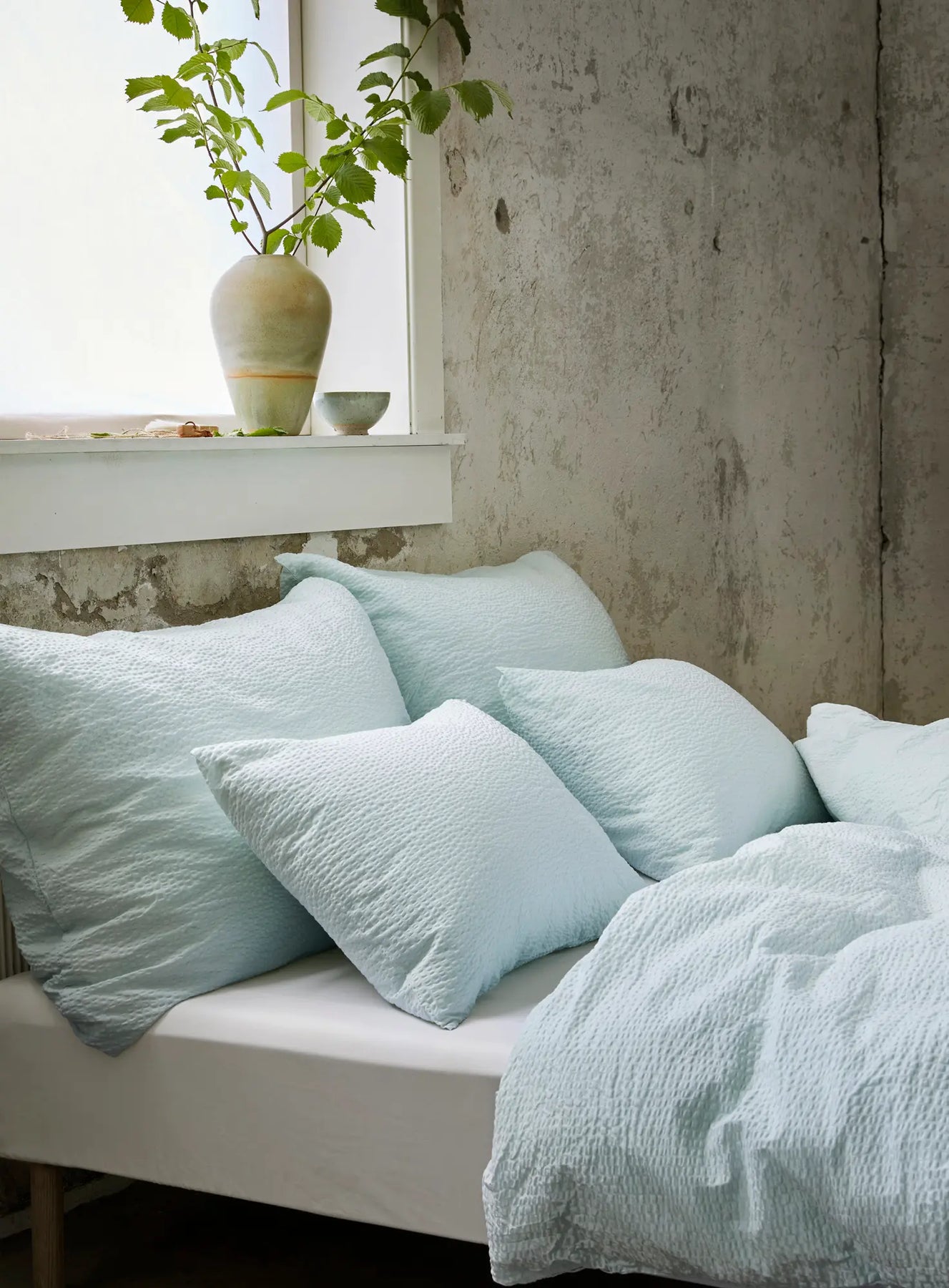 Raikkaan tuntuinen kreppipuuvilla tuntuu iholla ihanan viileältä – tyylikäs turkoosi väri antaa miellyttävän pastillisävyisen silauksen sisustukseen.