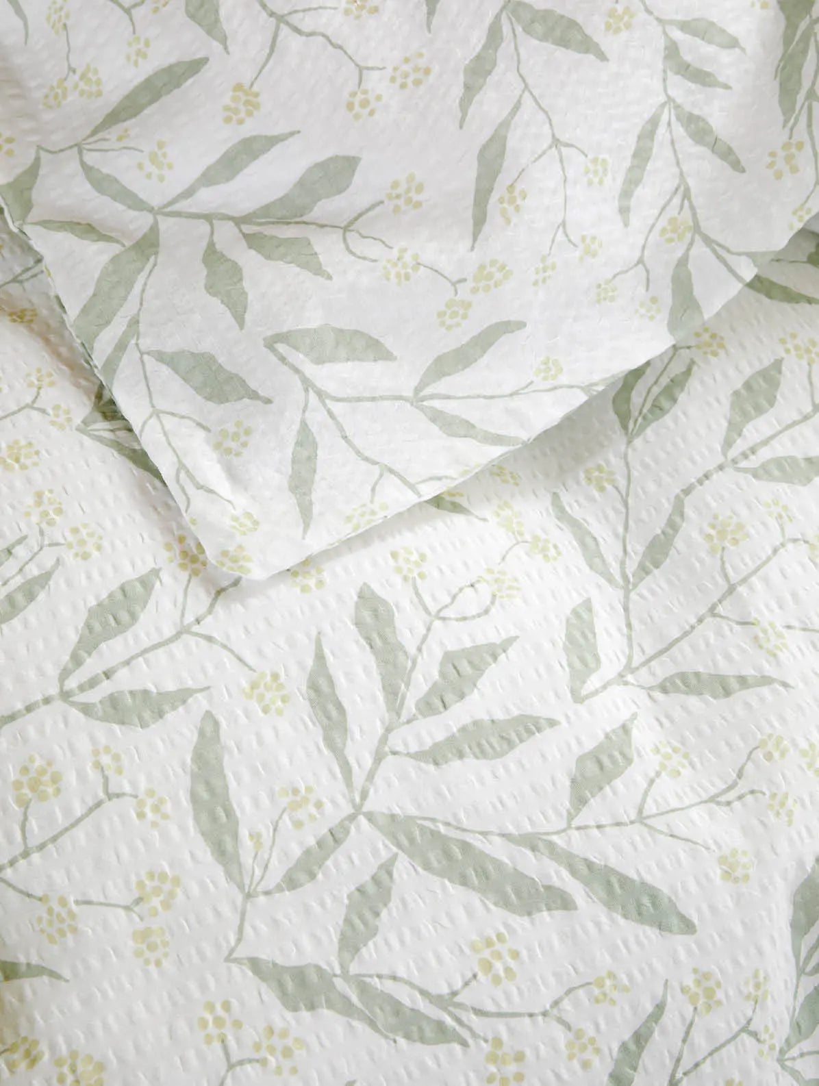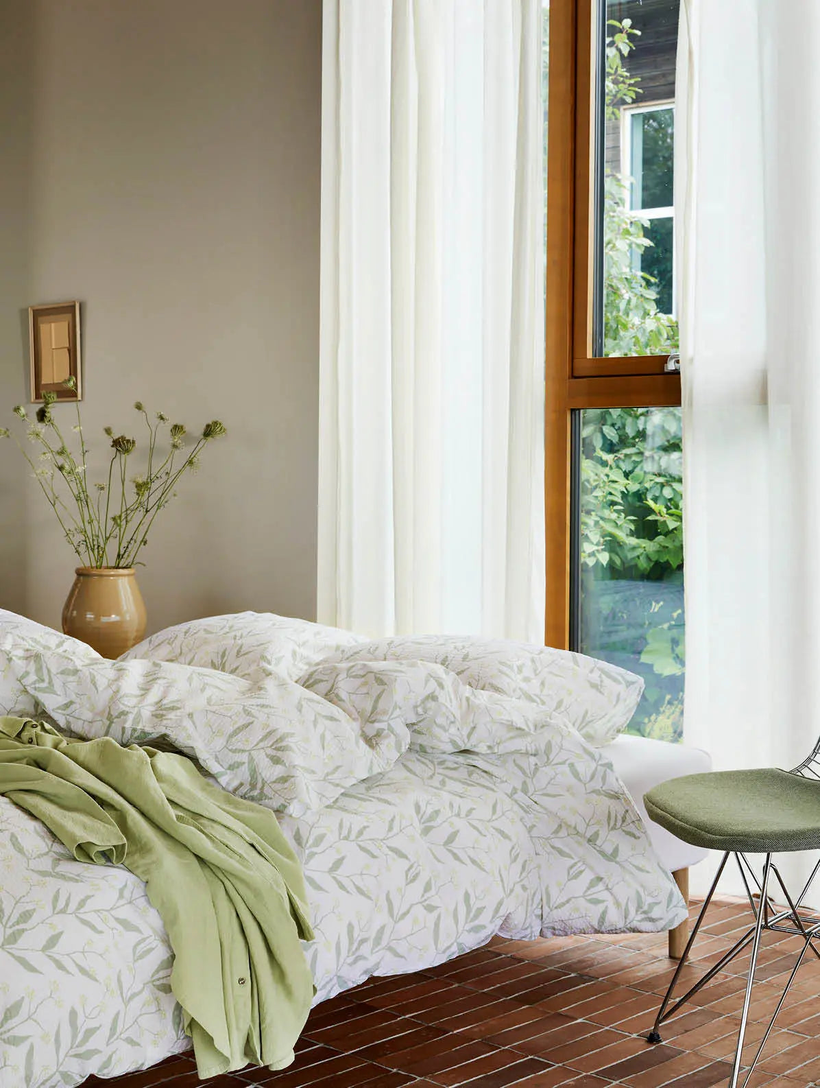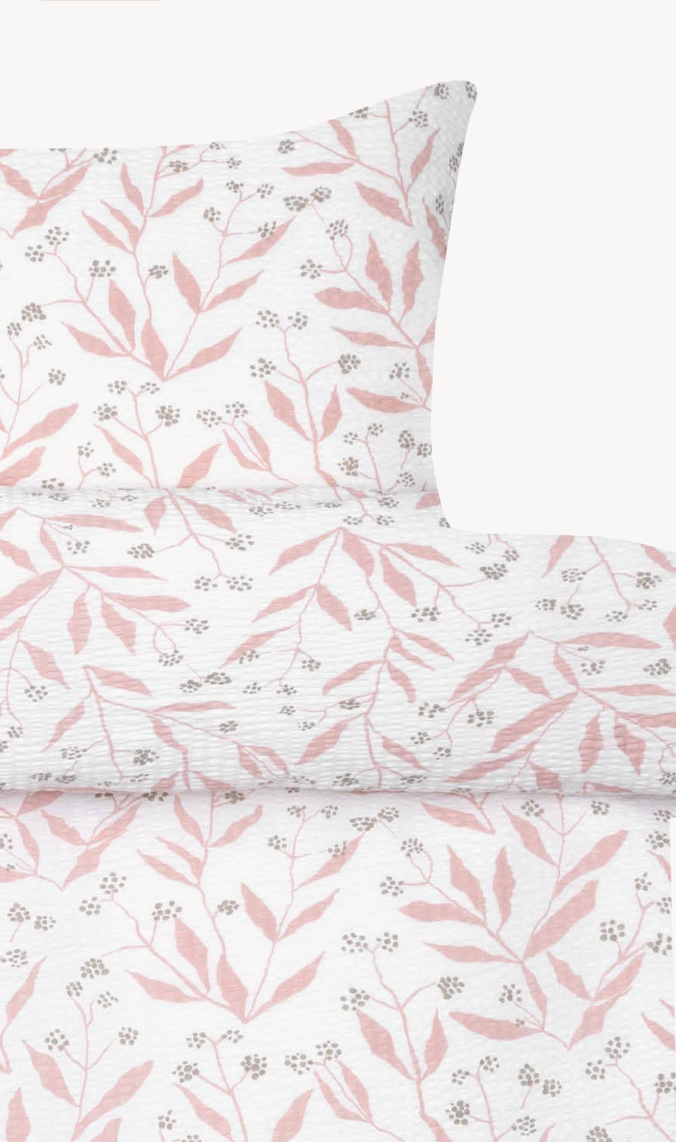 Raikkaan tuntuinen kreppipuuvilla tuntuu iholla ihanan viileältä – hillitty lehtikuviointi antaa setille viimeisen silauksen luonnontuntua.