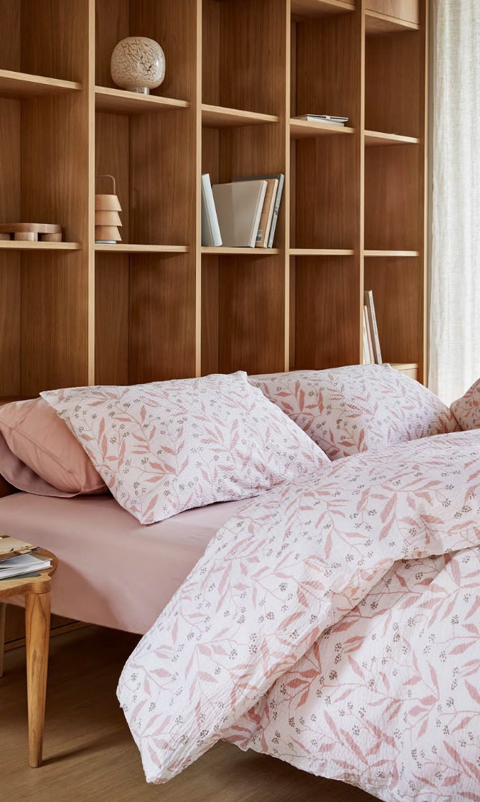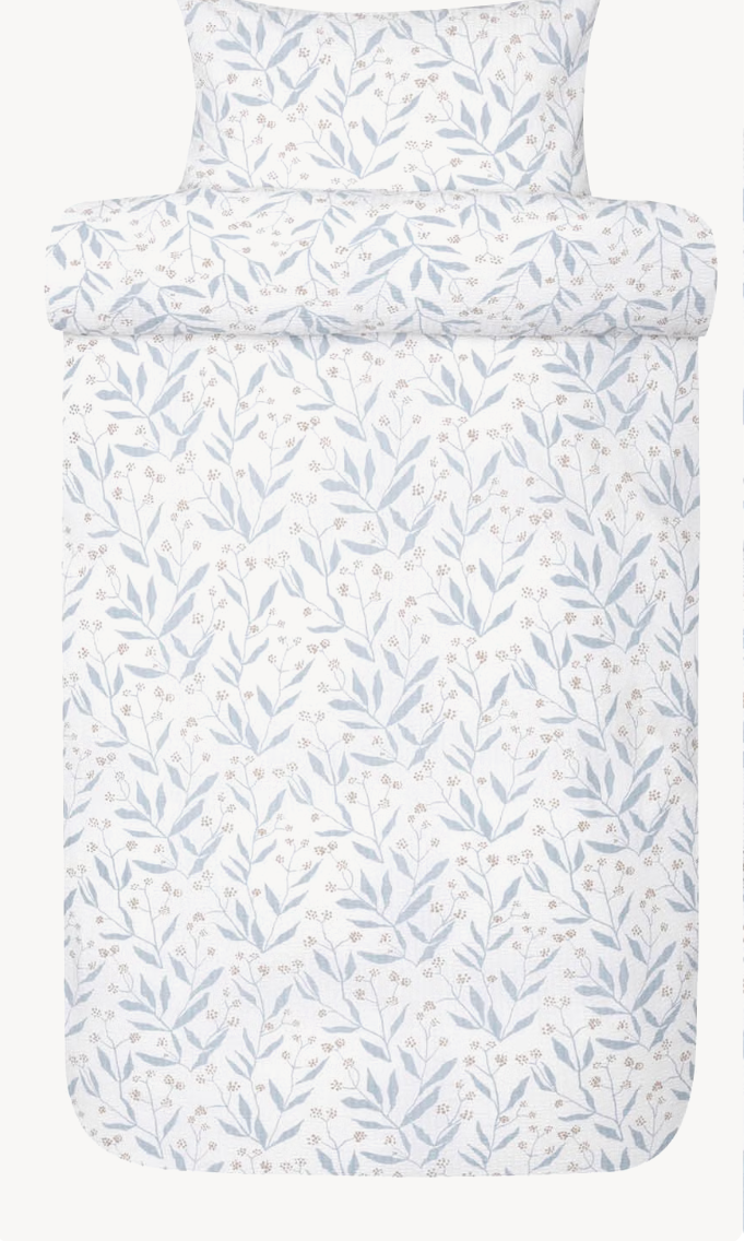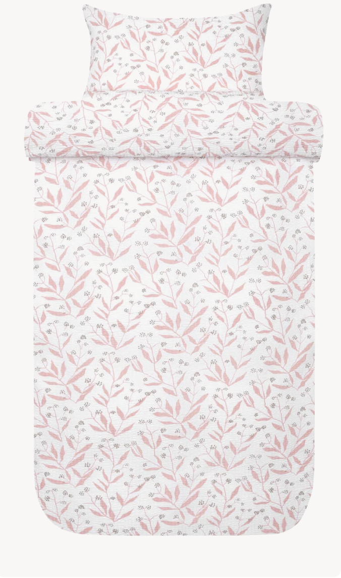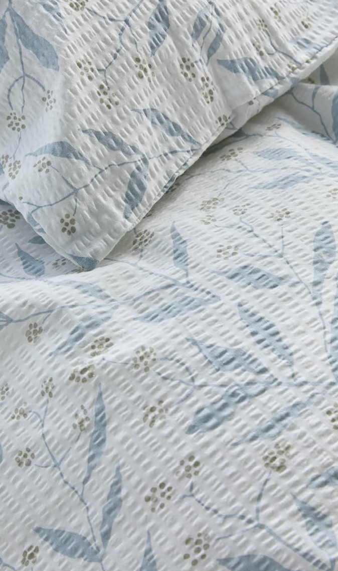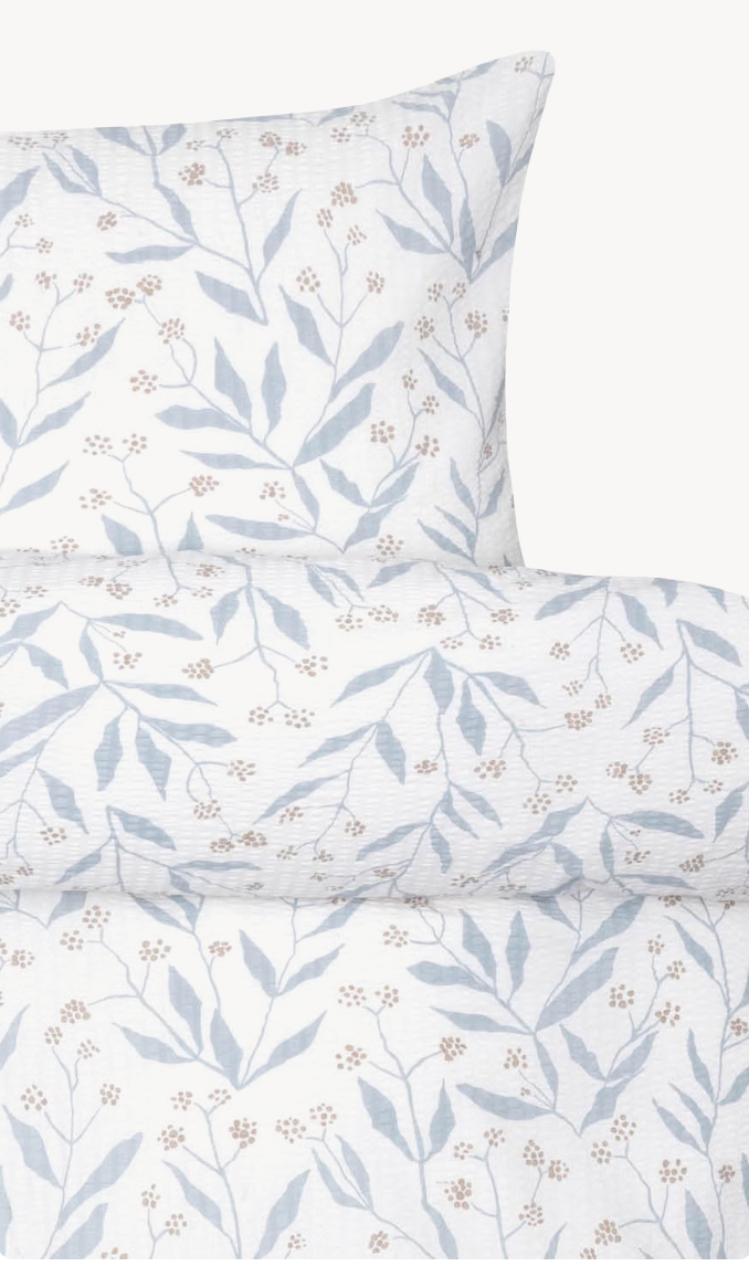 Raikkaan tuntuinen kreppipuuvilla tuntuu iholla ihanan viileältä – hillitty lehtikuviointi antaa setille viimeisen silauksen luonnontuntua.