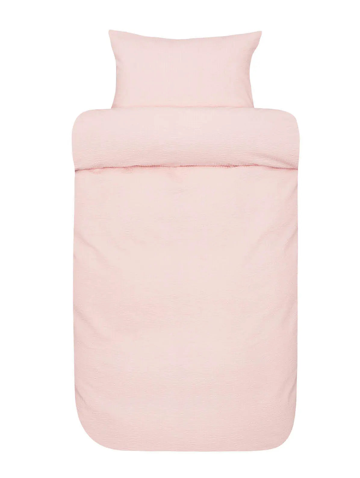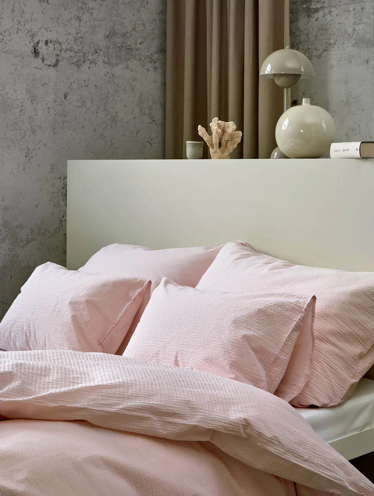Raikkaan tuntuinen kreppipuuvilla tuntuu iholla ihanan viileältä – tyylikäs vaaleanpunainen väri antaa miellyttävän pastillisävyisen silauksen sisustukseen.