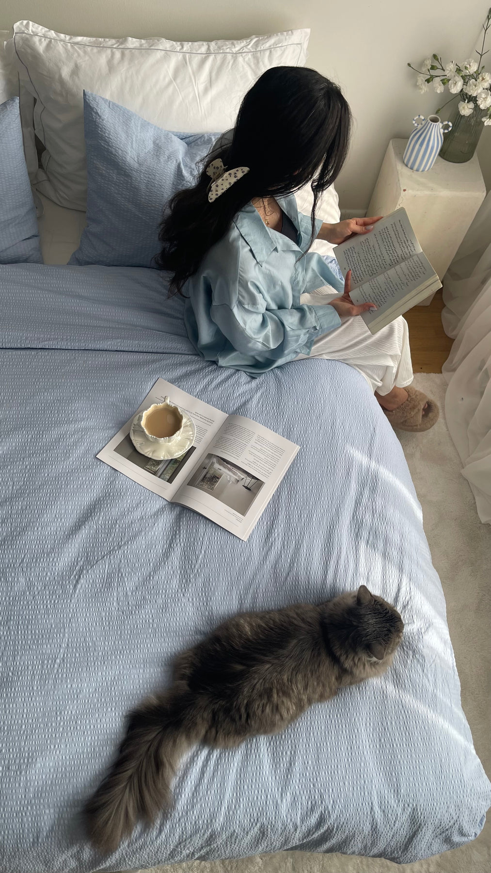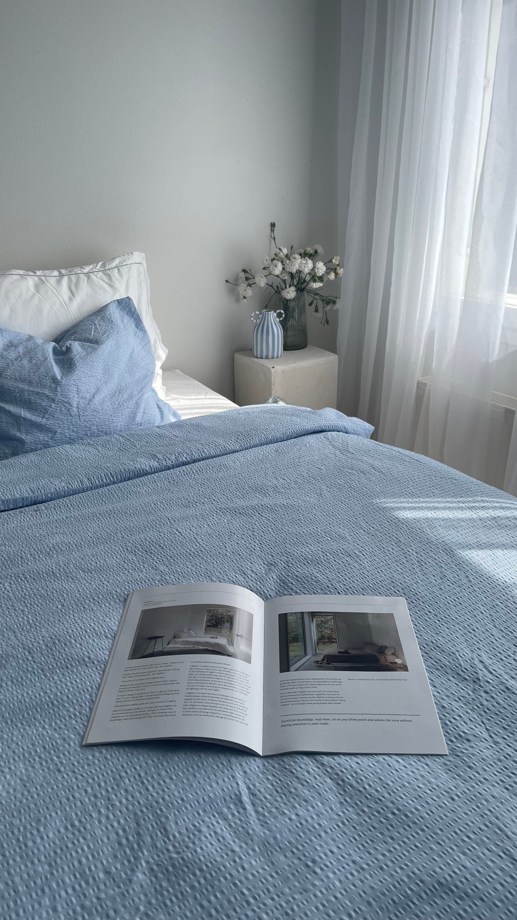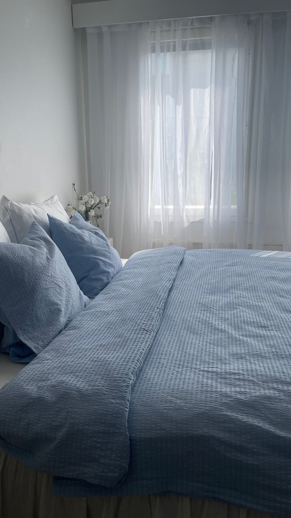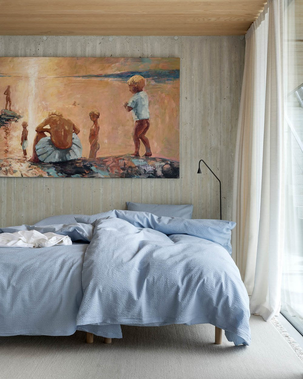 Kesäisen merimaiseman sininen sävy tuo raikkaan merituulen makuuhuoneeseesi – kreppimateriaali kruunaa aaltoilevan ja luonnollisen designin.