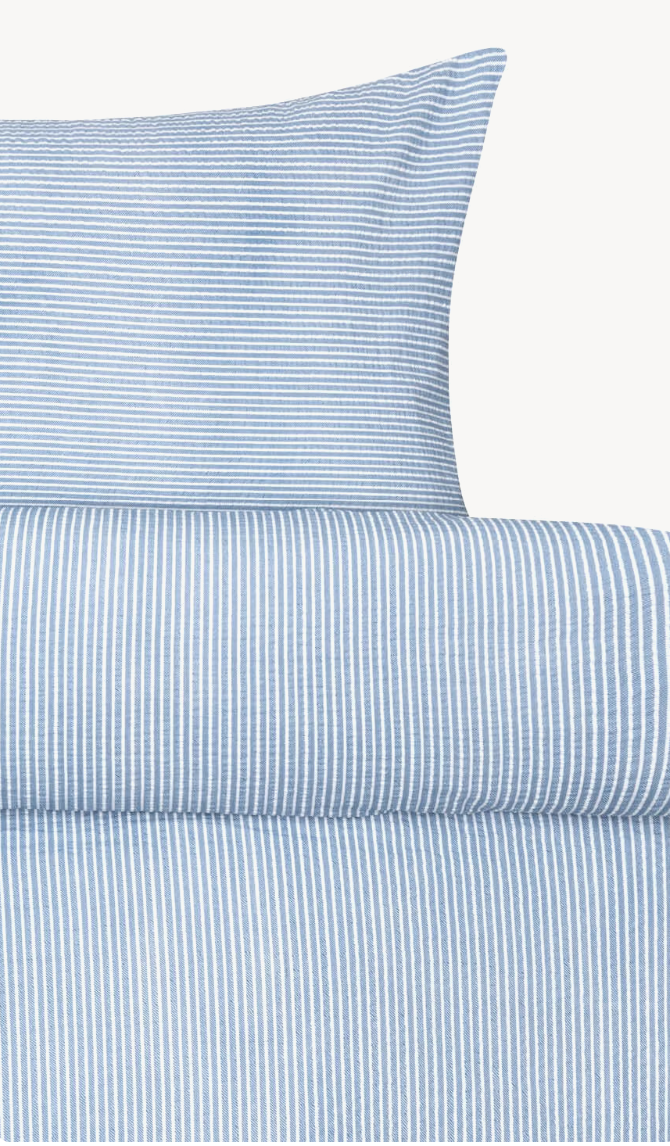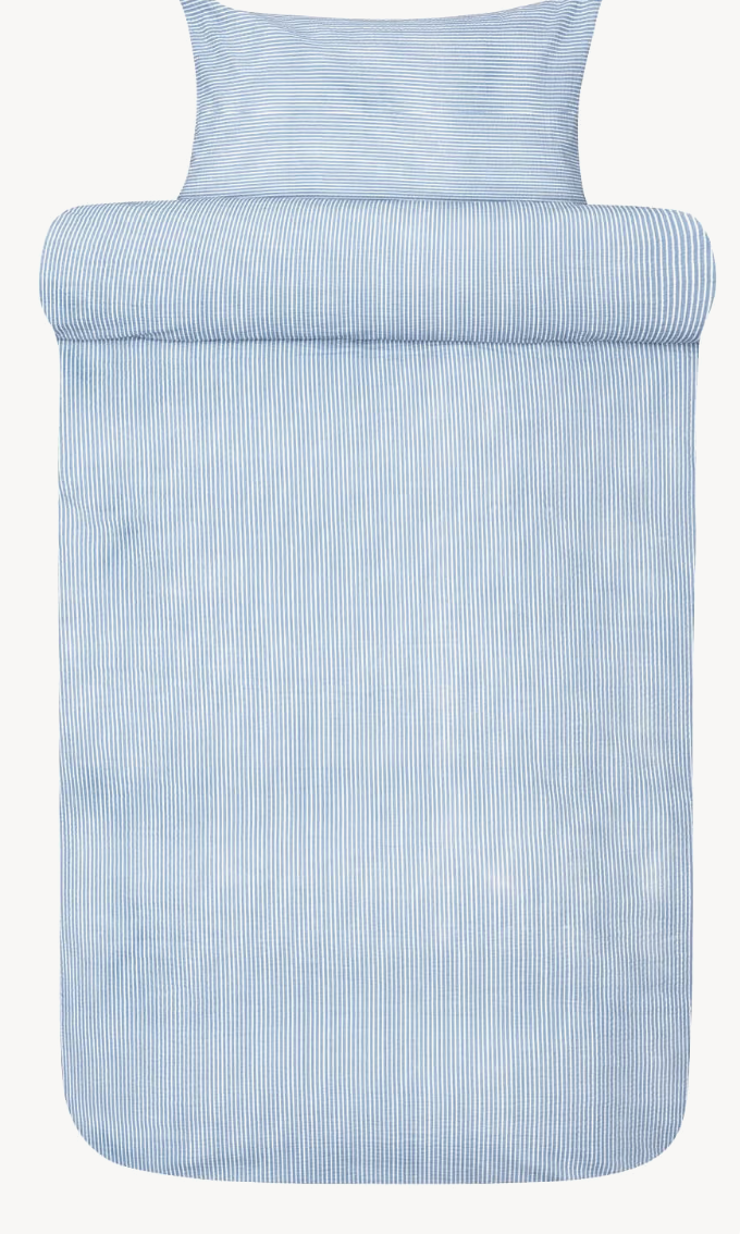 Lykke-pussilakanasetti tuo makuuhuoneeseen rauhallisen, klassisen ilmeen ajattomalla raidallisella kuosillaan ja syvällä denim-sinisellä sävyllä. Setti on valmistettu 100 % puuvillakreppistä, joka tuntuu kevyeltä ja mukavalta ihoa vasten sekä lisää sängyn ilmeeseen tekstuuria ja rentoa eleganssia.
