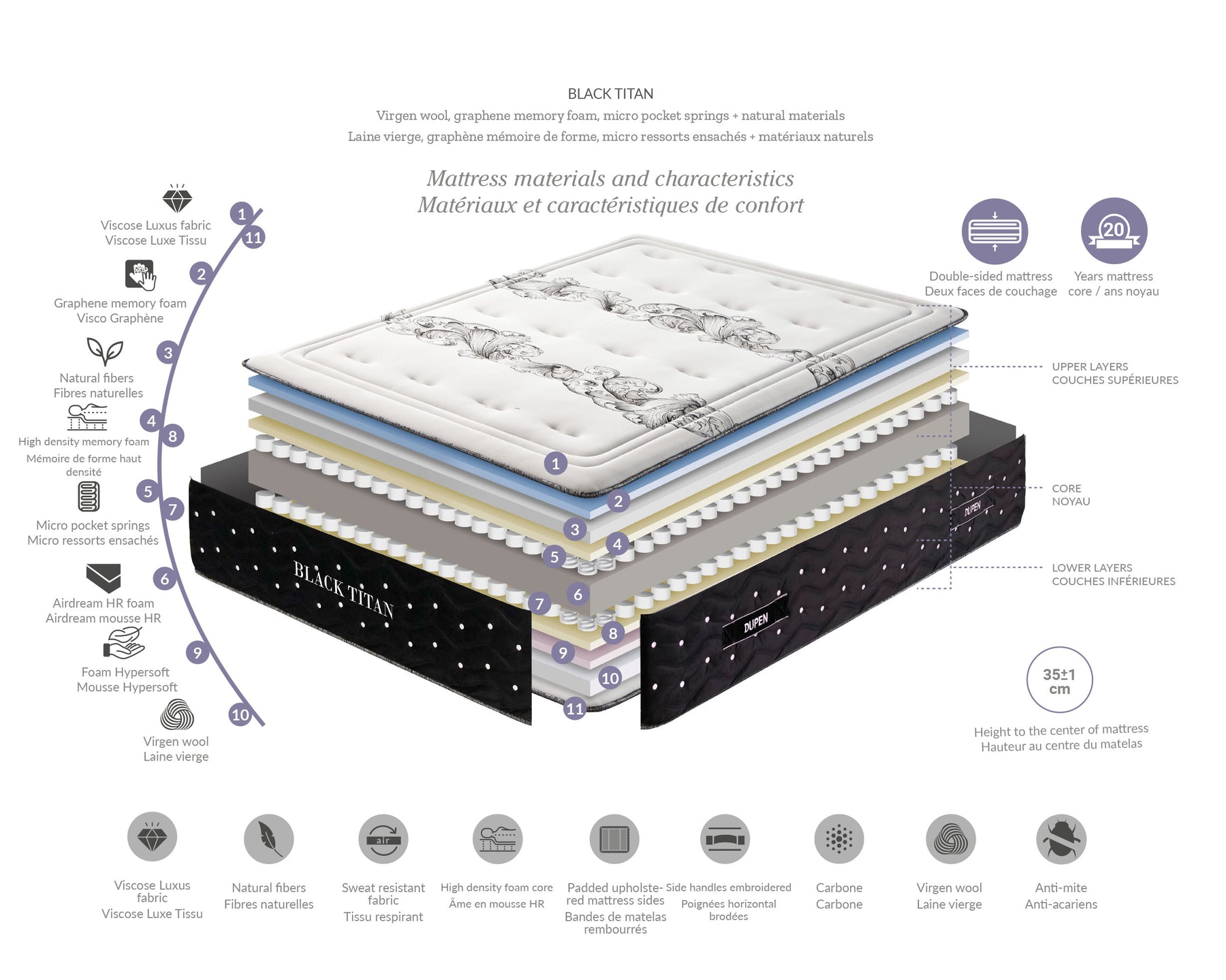 Patjassa yhdistyy mukavuus, teknologia, kestävyys, sekä ylellinen design. Kyseisen patjan ollessa suunniteltu kaikkein vaativimpien ja laatutietoisimpien asiakkaiden tarpeisiin, jolloin myös työnjälki on todella ensiluokkaista. Tämän takia Dupen tarjoaakin patjalle jopa 20 vuoden takuun. Tiheä vaahtomuovi patjan keskiössä yhdistettynä luonnon villaan, aktiivisiin hiilipartikkeleihin memoryfoamissa, sekä mikrokokoisiin pussijousiin tarjoaa nukkujalle uniikin ja ainutlaatuisesti mukautuvan unikokemuksen.