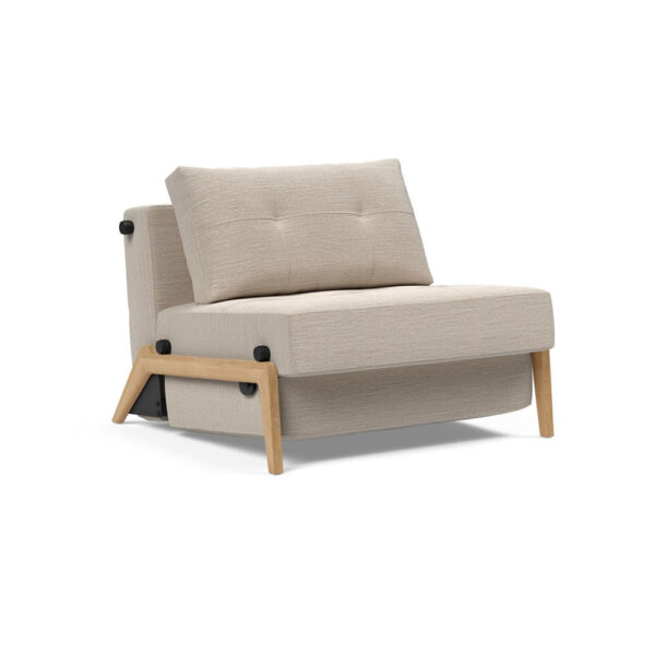 Nojatuoli kääntyy helposti yhden hengen vuoteeksi, jonka koko on 90 x 200 cm. Tuolissa on äärimmäisen tyylikkäät lakatut tammijalat ja kiinteä kangasverhoilu.