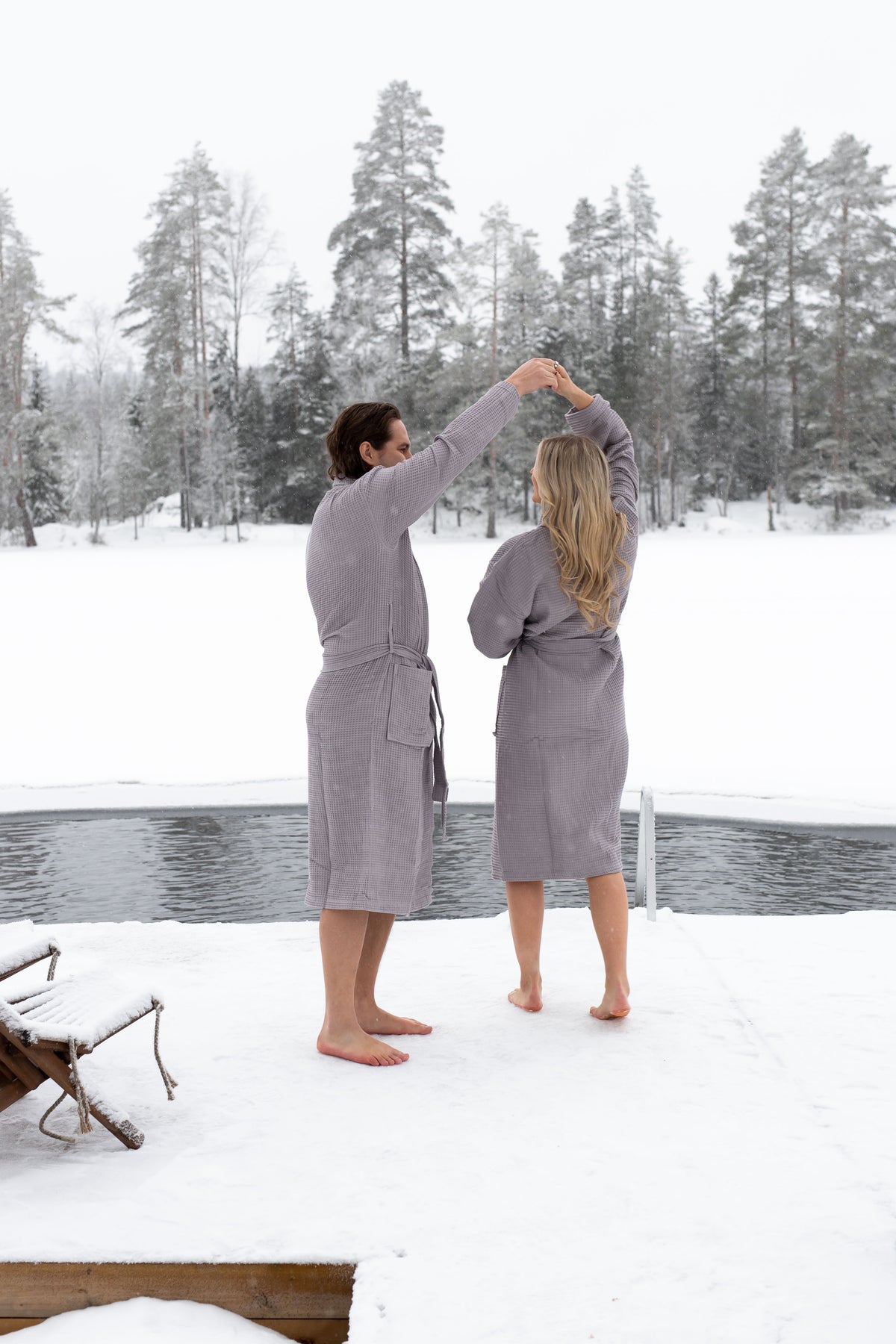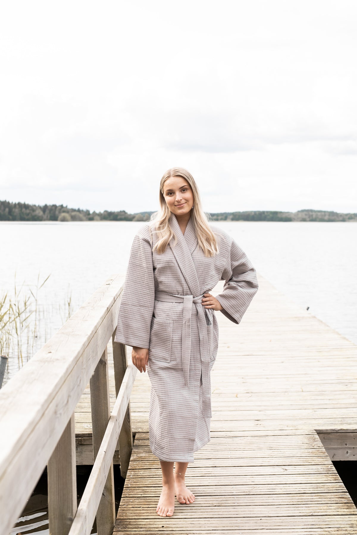 - Kevyt vohvelikangas, joka hengittää ja kuivuu nopeasti. Täydellinen suihkun tai saunan jälkeen.