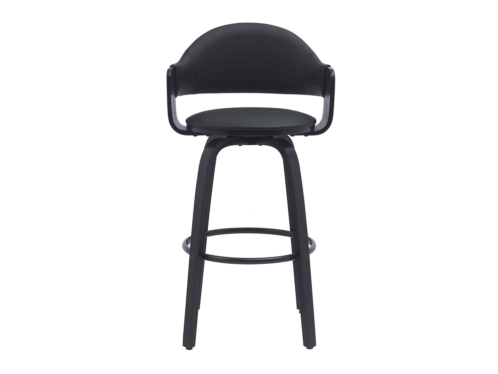 Tuolin runko on valmistettu mustaksi lakatusta puusta, ja istuin on verhoiltu kestävällä mustalla keinonahalla. 360 asteen kääntömekanismi lisää käytännöllisyyttä ja mukavuutta, tehden tuolista ihanteellisen valinnan niin keittiösaarekkeelle kuin baaripöydän ääreen.