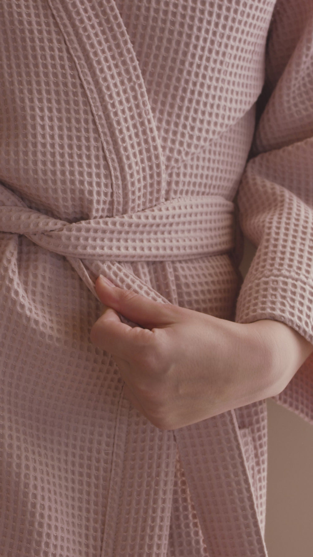The waffle fabric feels pleasantly light and airy on the skin, providing a non-sweaty, yet slightly warming feel. The dressing gown can be worn all year round. The pink color is pleasing to the eye, offering a fresh and modern touch.