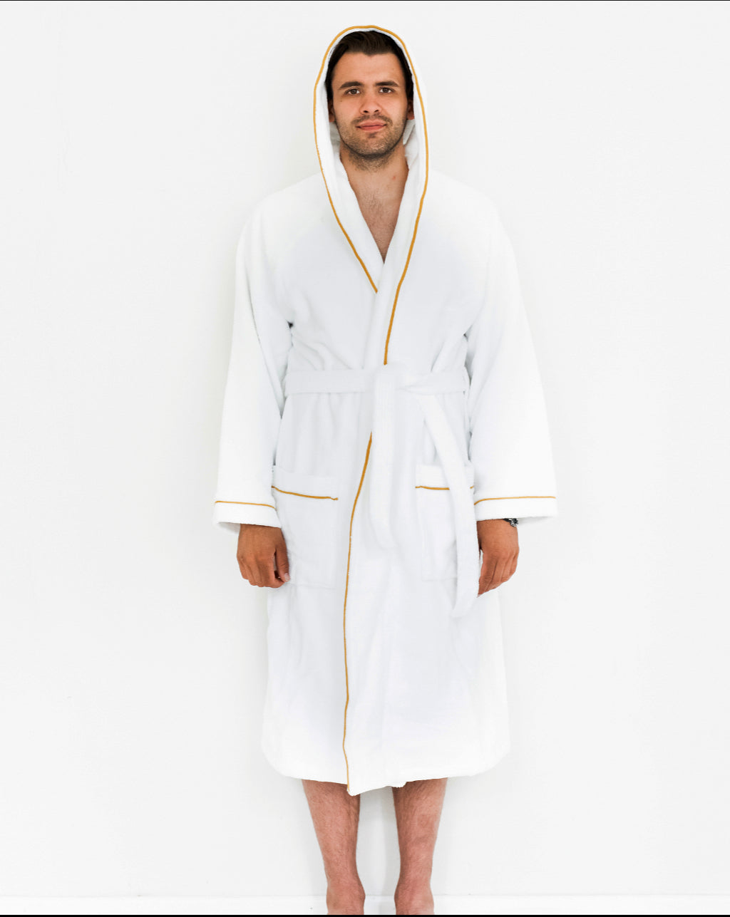 The Hotel High End Hooded Bathrobe is designed for use only in the finest luxury hotels, so its construction is made extremely durable, yet very luxurious, to keep even the most demanding guests satisfied. The inside of the bathrobe is cotton terry, which feels pleasantly soft and breathable on the skin. It also absorbs water when placed on wet skin, like a terry towel. The outside is extra soft, short-cut microfiber, which creates a pleasant silky softness on the outside and a stylish appearance that will last for years.
