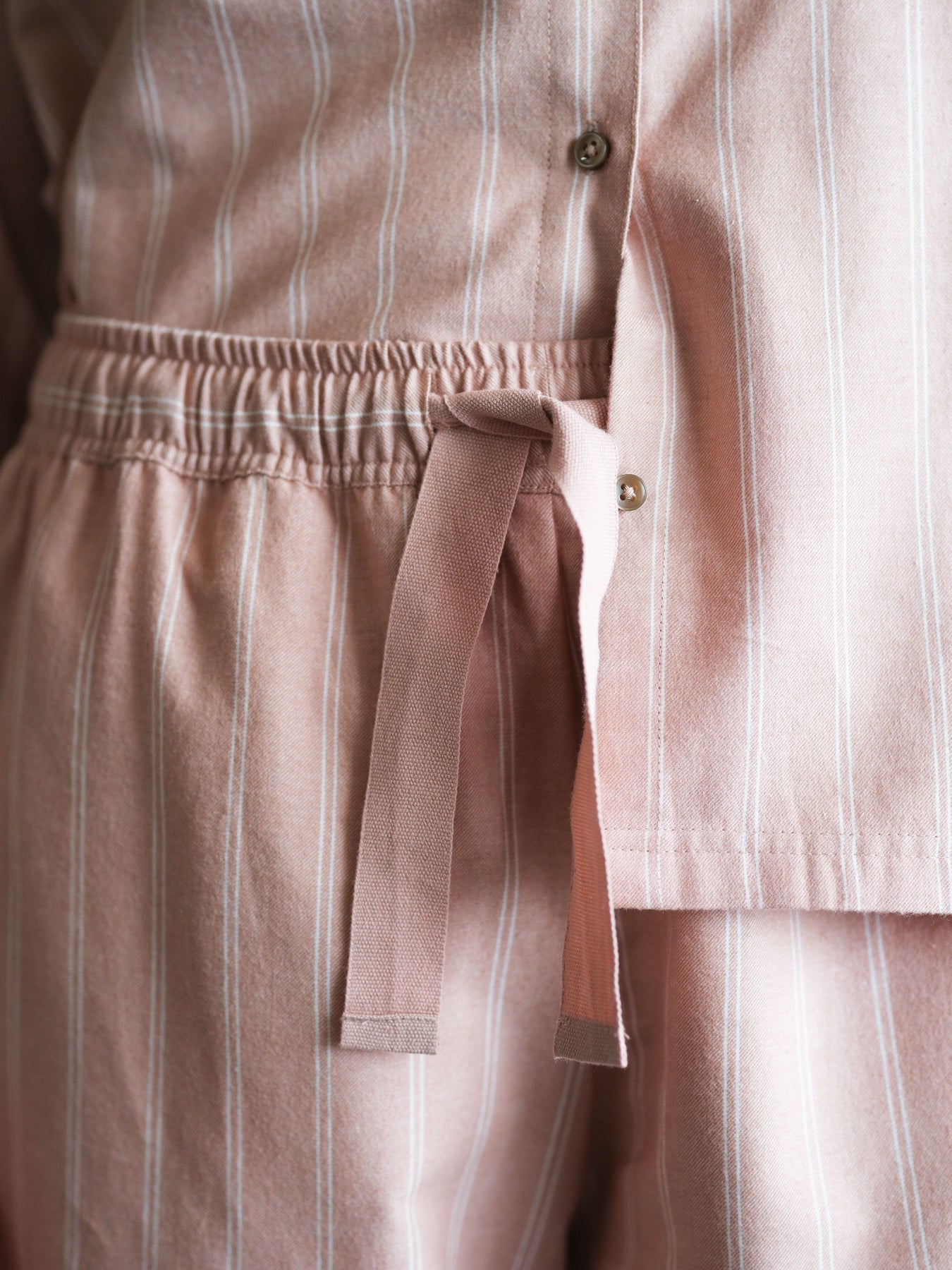 The flannel material breathes excellently, but at the same time gives the skin a warm feeling, which feels wonderful on winter mornings and evenings. The pants and shirt are sized appropriately loose, so they don't tighten while sleeping, but look presentable when worn. There is a drawstring at the waist. The shirt has buttons and idyllic collars.
