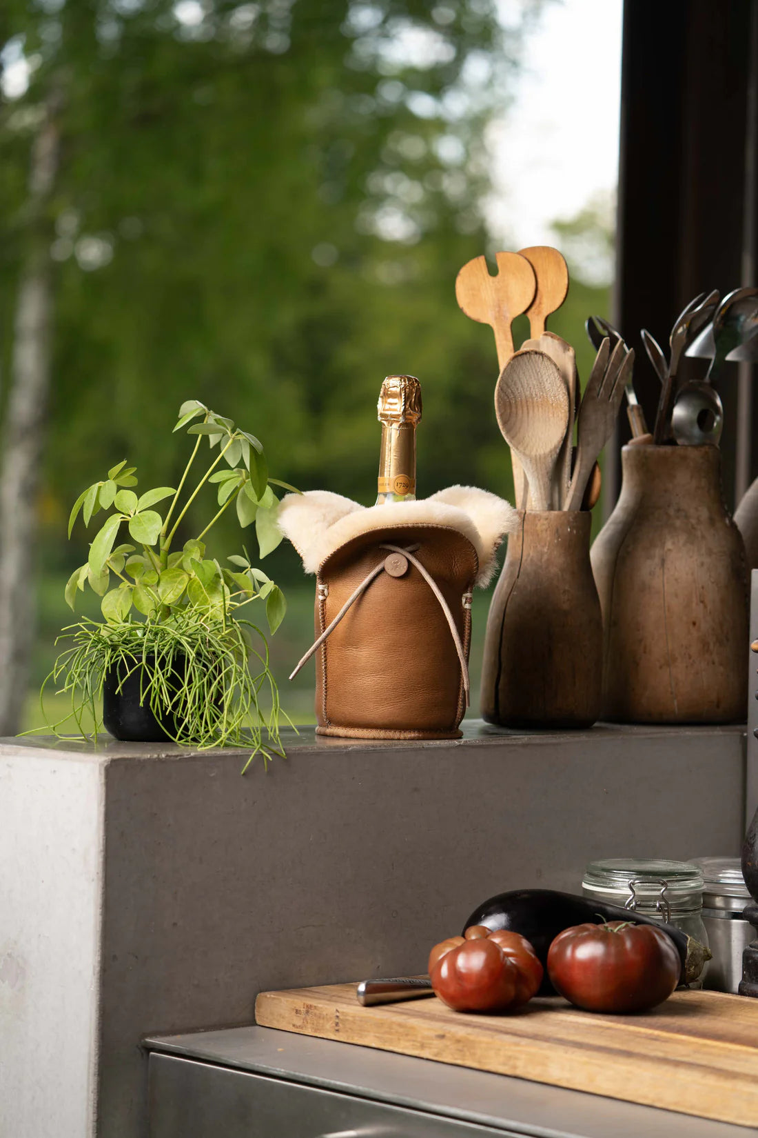 KYWIE XL shampanja cooler pitää arvokkaat Dom Perignon, Ruinart ja muut leveäpulloiset shampanjat viileinä jopa tuntien ajan kesähelteellä, kiitos erittäin hyvän eristyskyvyn omaavan 100% lampaannahan ja -villan. Näyttävä ja uniikki cooler nousee varmasti juhlien keskustelun aiheeksi!