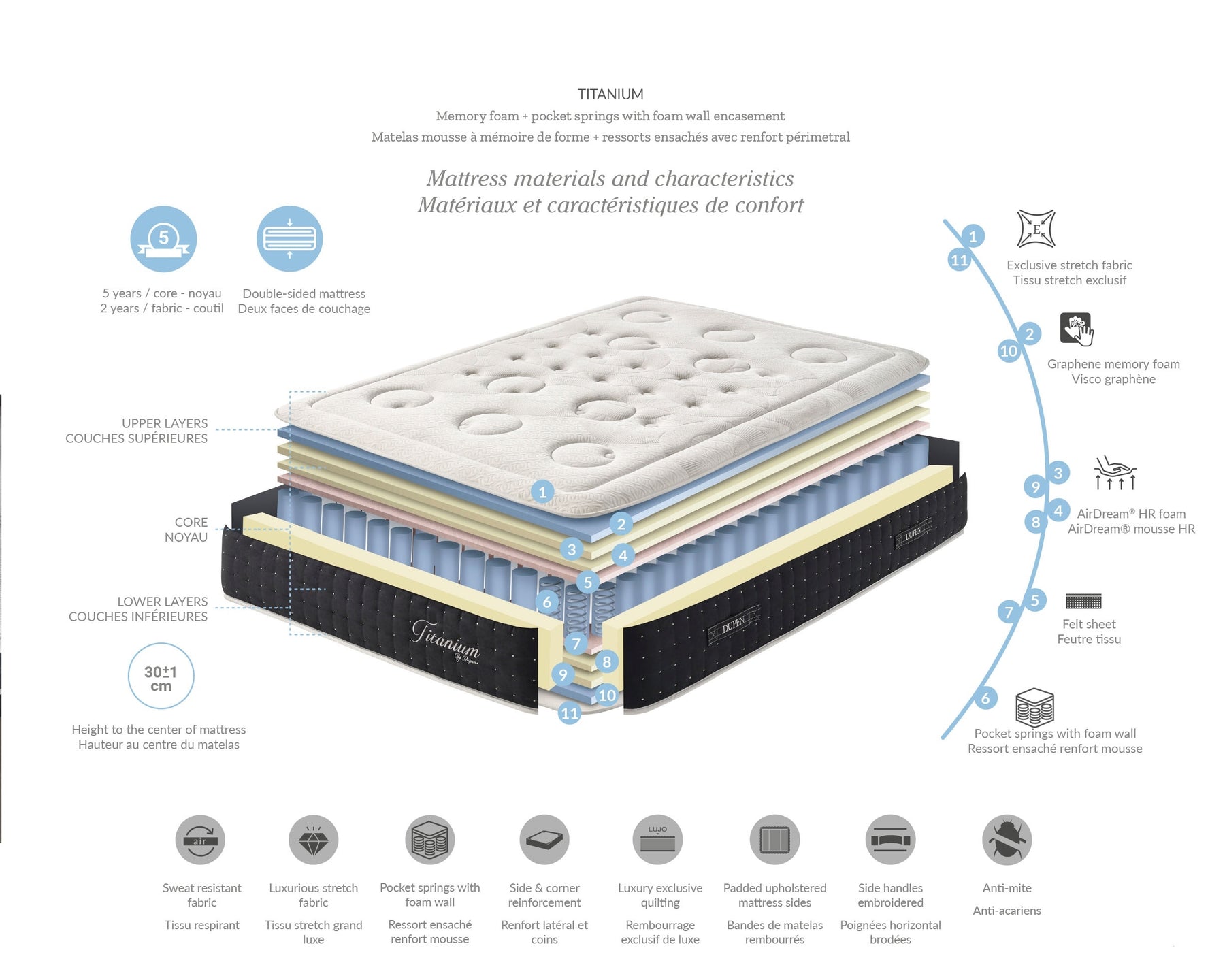 Madrassen använder tätt memoryskum med grafen och naturliga fibrer, är allergivänlig och andningsbar, med behandling mot dammkvalster. Vadderade kanter säkerställer mjuk men fast sittkomfort på sängkanten. De ursprungliga fodren är fyllda med naturfiber. Pocketfjädrar omgivna av skumplast säkerställer lång livslängd och orörlighet för fjädrarna. 4 bäröglor på kanterna gör det lättare att vända och positionera madrassen. Vid användning placeras öglorna diskret på madrassens yta.