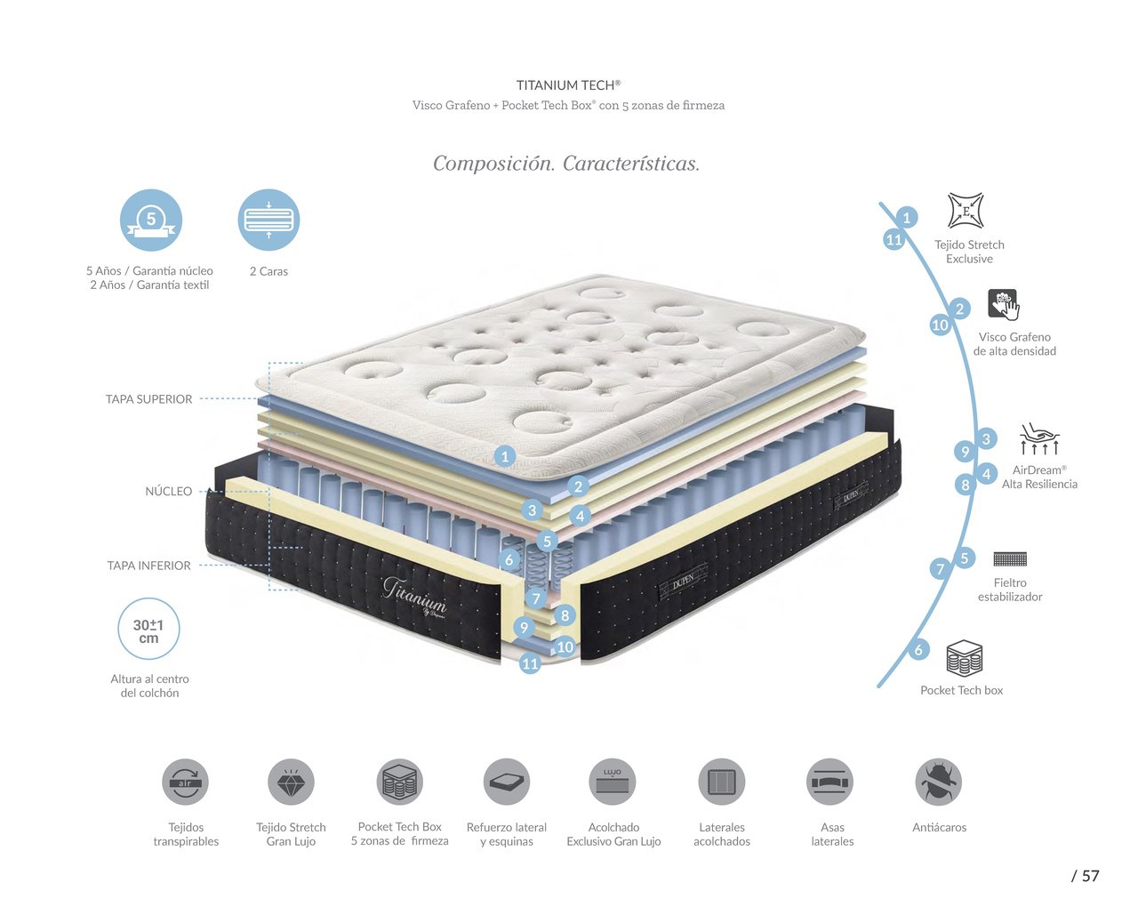 Denna madrass har en kärna av fria pocketfjädrar som stöds av ett skum som omger madrassen. Dessa fjädrar har 5 fasthetsnivåer, placerade så att tyngre delar av kroppen har styvare fjädrar och lättare delar har lättare fjädrar, vilket optimerar kroppens position under sömnen. Det täta grafenminnesskummet är ett material som reagerar mycket snabbt på värme och elektricitet, vilket frigör elektrisk laddning från kroppen, särskilt från leder och muskler, vilket i sin tur påskyndar och förbättrar återhämtningen. Denna senaste återhämtningsteknik är mycket populär i Dupens hemland Spanien.