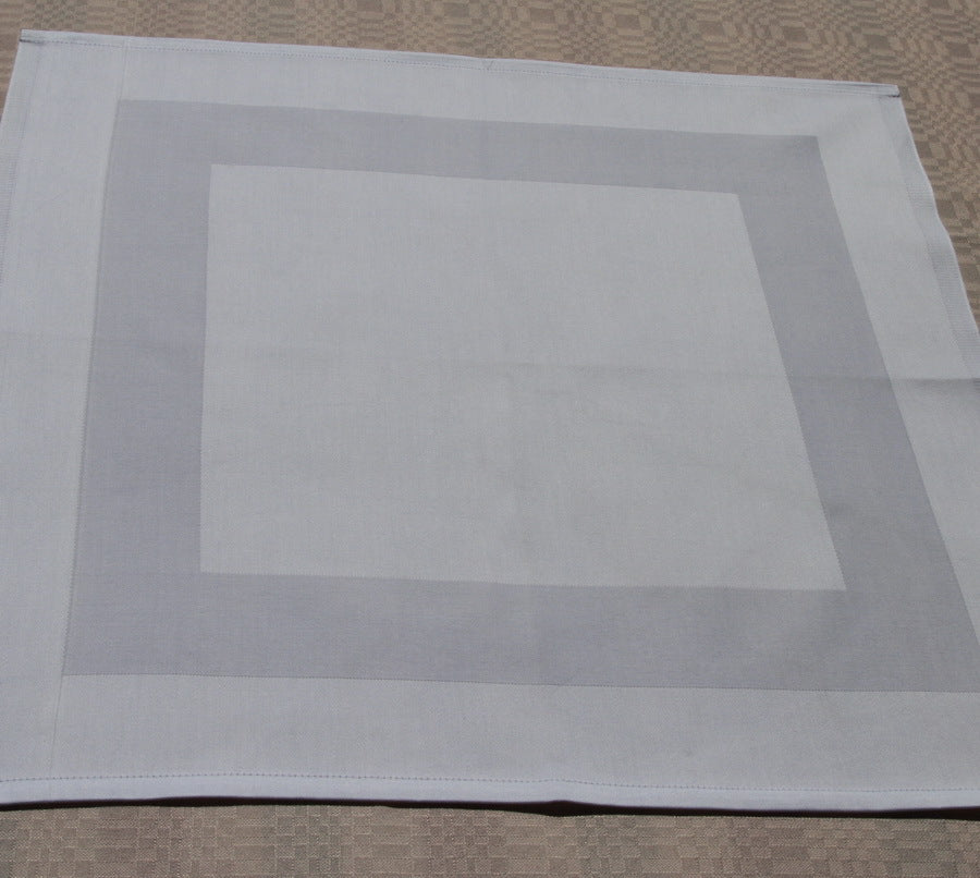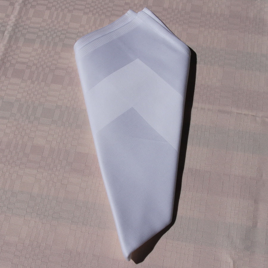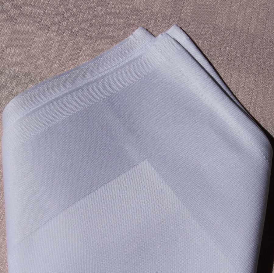 Mjuk, absorberande bomull är ett mycket bättre material och bekvämare att använda än pappersversioner. Den vita servetten är vävd i Atlaskante (den vävda balkbjälken lindas runt kanterna). Två kanter är fållade och två är fållade, i enlighet med kraven för institutionell tvätt.
