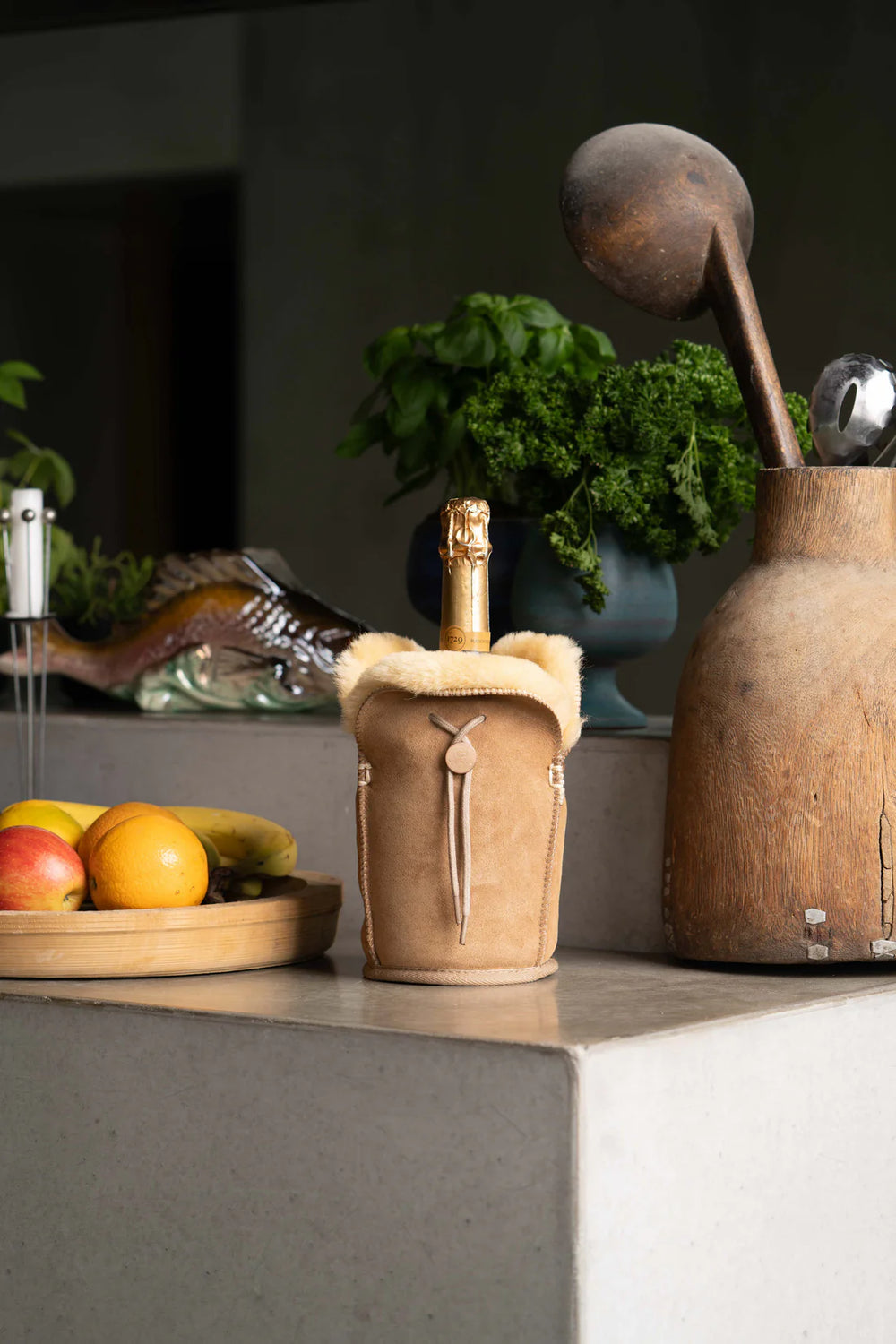 KYWIE XL shamppanja cooler on Texel-lampaannahasta valmistettu cooler, joka pitää kylmän shamppanjapullosi viileänä 4 tunnin ajan jopa kesähelteellä. Lämmöneristyksen kruunaa kaulalle asettuva tiukka villainen "ilmalukko", joka estää viileän ilman karkaamisen kaulaa pitkin. Cooleriin yhdistetty kantohihna helpottaa kantamista esimerkiksi piknikille. Villa on luontaisesti likaahylkivä, joten coolerin käyttö ja huolto on helppoa ja huoletonta. Cooler toimii myös tyylikkäänä suojana pullolle yllättäviltä kolhuilta.